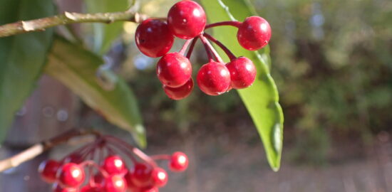<自然新着情報!>マンリョウの実が赤くみずみずしく実っています。森はいよいよ冬景色です。(◀2025…