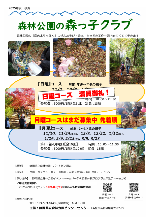 ・申し込み〆切後、4~5日以内に【抽選結果メール】にてご参加になれるかどうかをお知らせします。もしメールが届かない場合には、バードピア浜北まで電話にてお問い合わせ下さい。